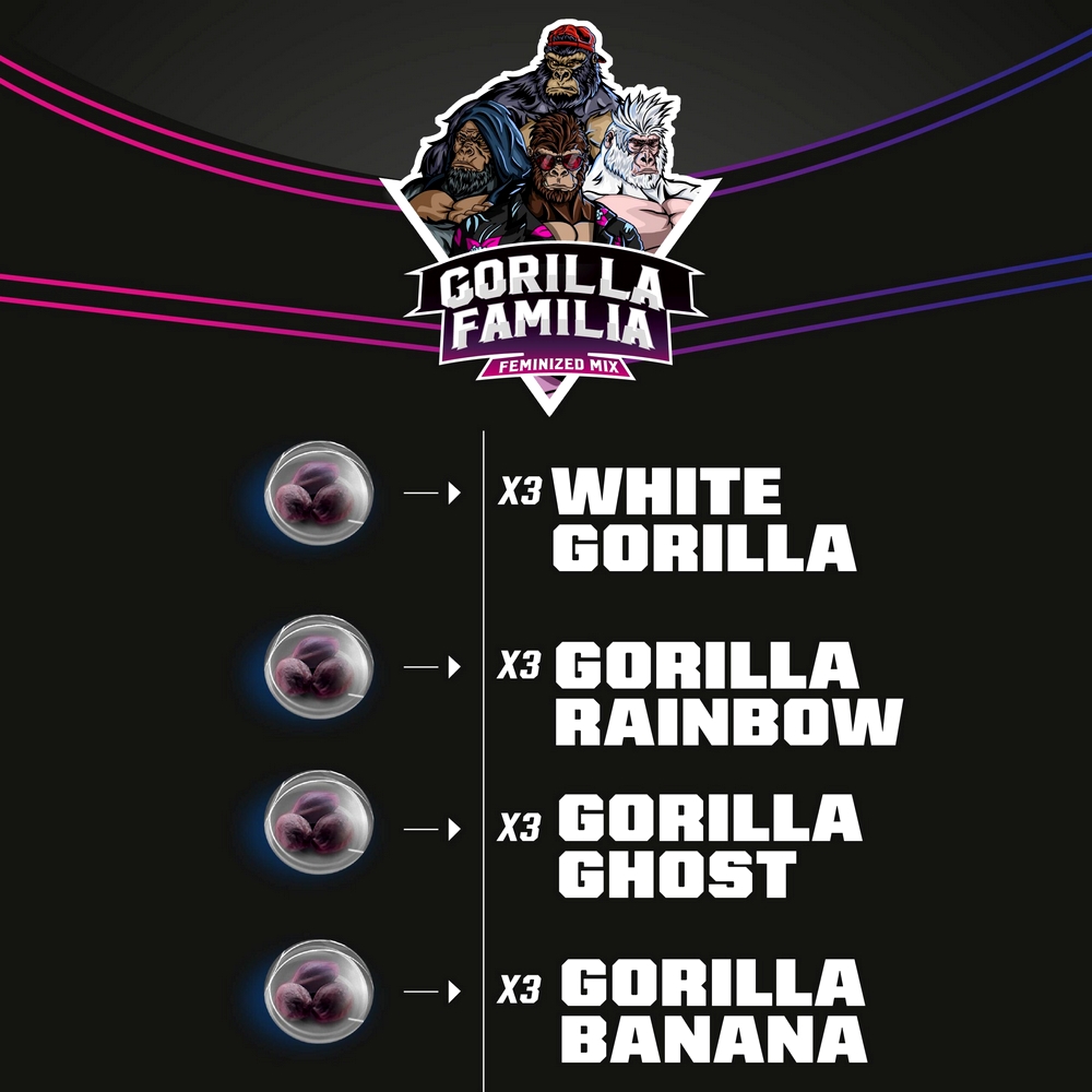 Gorilla Familia Feminized, está compuesta por Gorilla Rainbows, White Gorilla, Gorilla Banana y Gorilla Ghost cada uno con 12 semillas, 3 por variedad separadas en burbujas independientes para facilitar su cultivo.